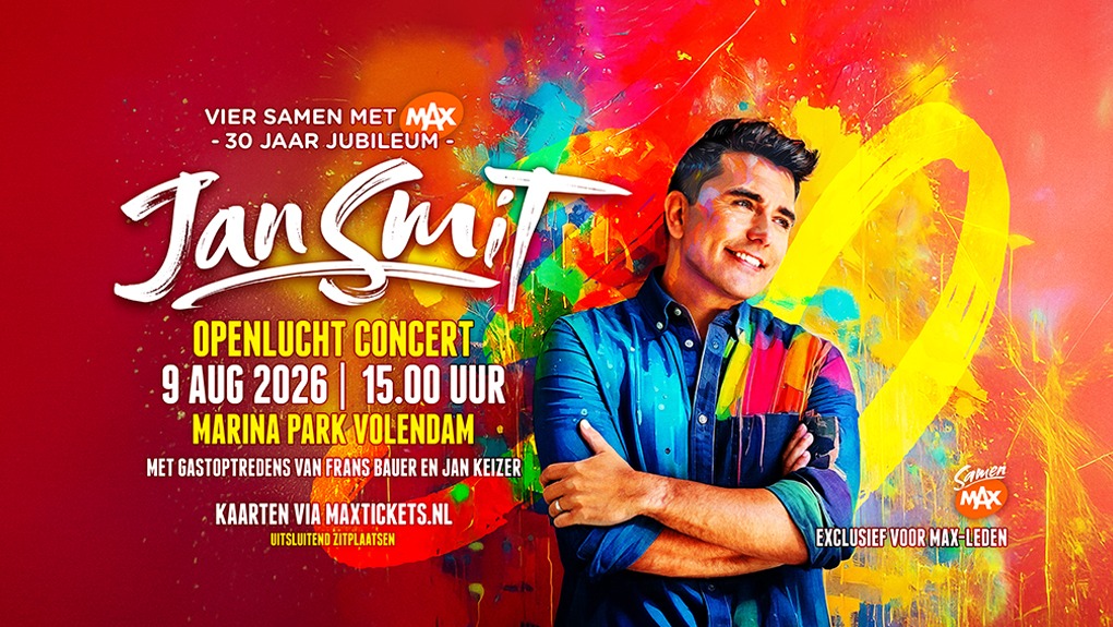 In 2026 viert Jan Smit zijn 30-jarig jubileum met een groots concert in het Marina Park in Volendam. Samen met MAX organiseert hij op zondag 9 augustus een unieke middag, exclusief voor Leden van MAX, waar u in de openlucht kunt genieten van een zomers, tranquilo concert met uitsluitend zitplaatsen.